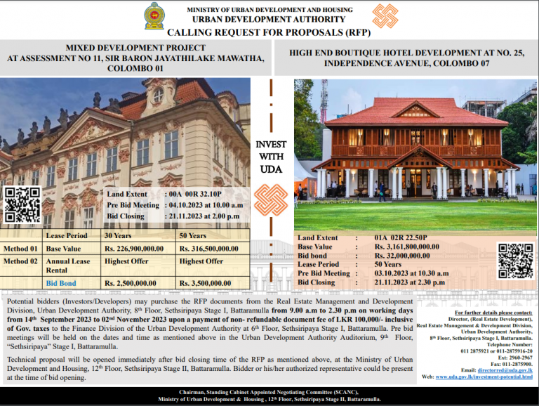 CALLING REQUEST FOR PROPOSALS (RFP) for MIXED DEVELOPMENT PROJECT AT ASSESSMENT NO 11, SIR BARON JAYATHILAKE MAWATHA, COLOMBO 01. & HIGH END BOUTIQUE HOTEL DEVELOPMENT AT NO. 25, INDEPENDENCE AVENUE, COLOMBO 07 More Details