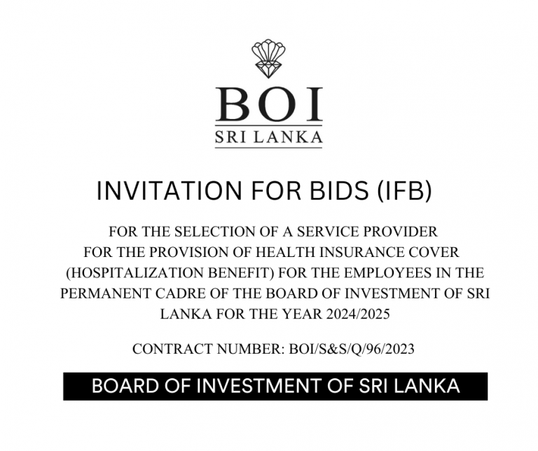 INVITATION FOR BIDS FOR THE SELECTION OF A SERVICE PROVIDER FOR THE PROVISION OF HEALTH INSURANCE COVER (HOSPITALIZATION BENEFIT) FOR THE EMPLOYEES IN THE PERMANENT CADRE OF THE BOARD OF INVESTMENT OF SRI LANKA FOR THE YEAR 2024/2025 More Details
